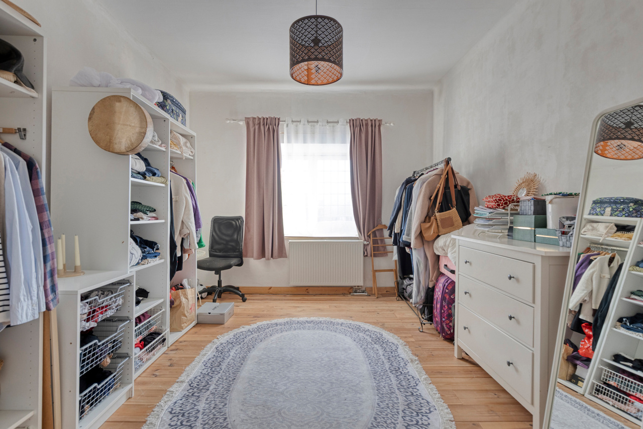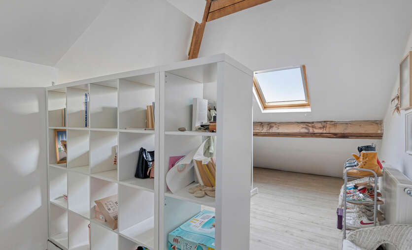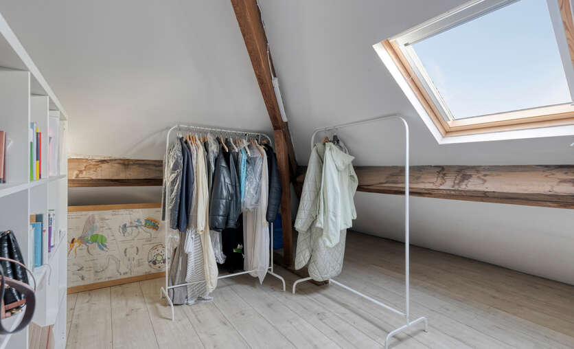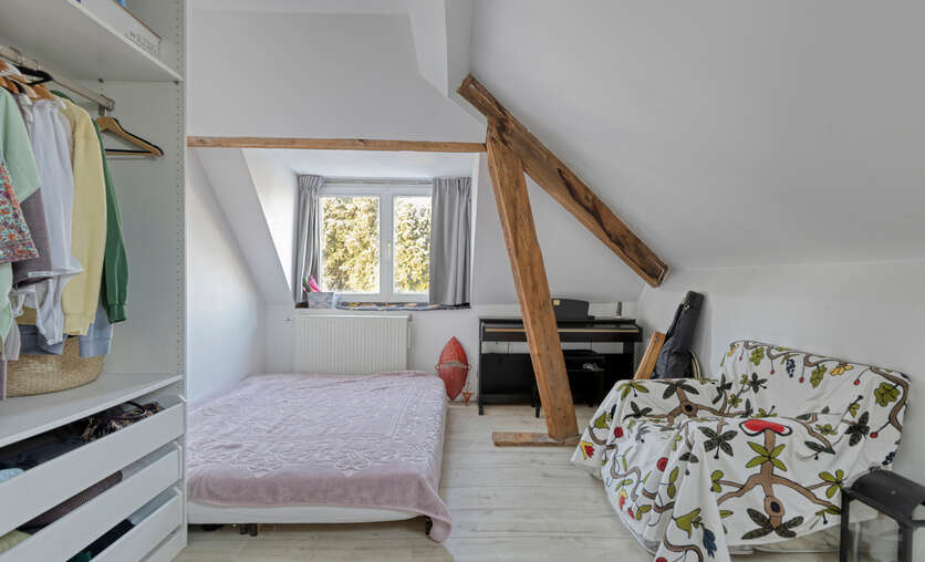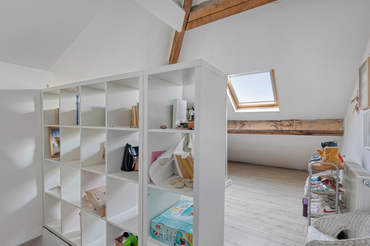 De zolderverdieping werd ingericht met een ruime slaapkamer, aangevuld met een extra ruimte die perfect kan dienen als bureau of dressing. Deze verdieping biedt een flexibele indeling en kan eenvoudig worden aangepast aan uw woon- of werkbehoeften.