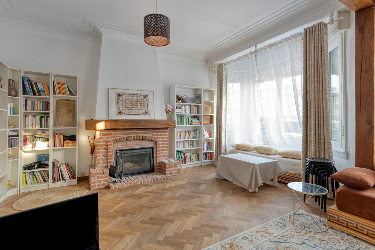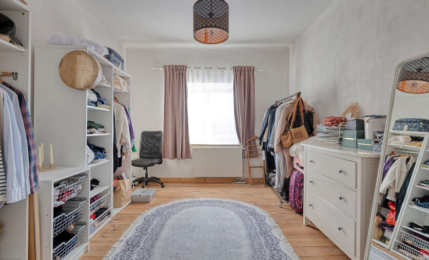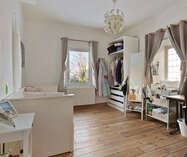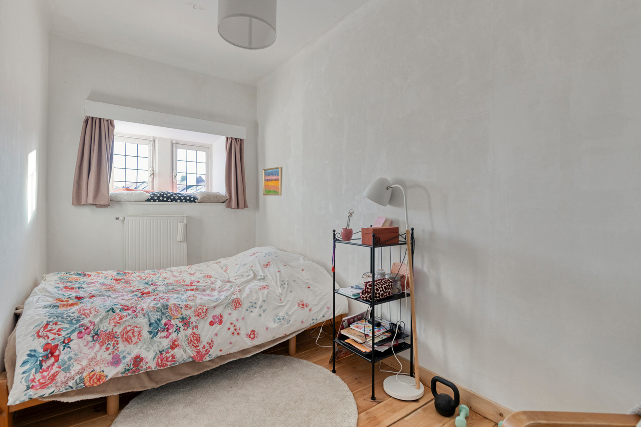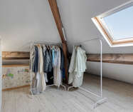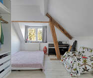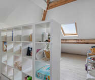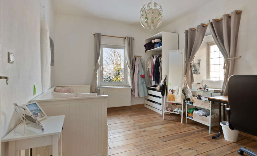 De zolderverdieping werd ingericht met een ruime slaapkamer, aangevuld met een extra ruimte die perfect kan dienen als bureau of dressing. Deze verdieping biedt een flexibele indeling en kan eenvoudig worden aangepast aan uw woon- of werkbehoeften.