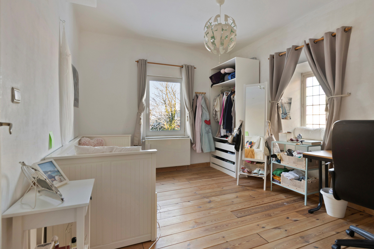 Op de eerste verdieping bevinden zich twee slaapkamers, waarvan één kamer beschikt over een dressing die ook kan ingericht worden als aparte kamer. Daarnaast is er een badkamer aanwezig.