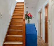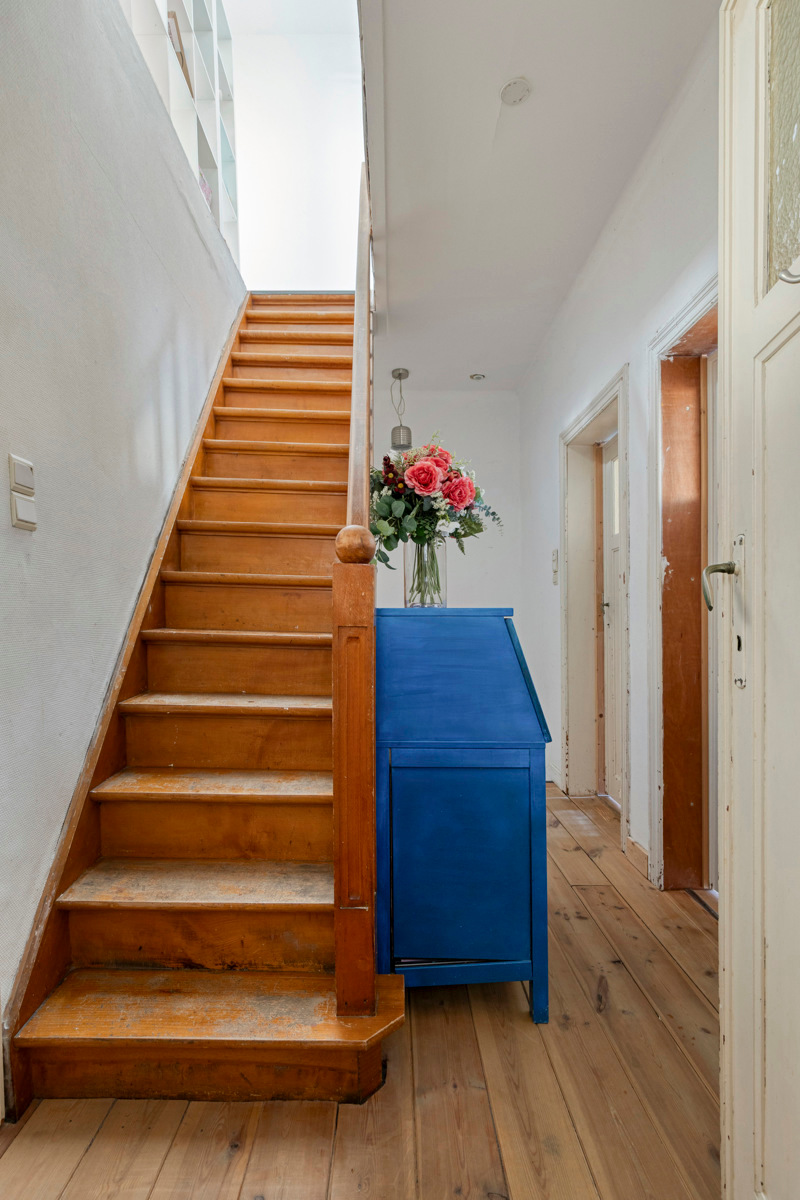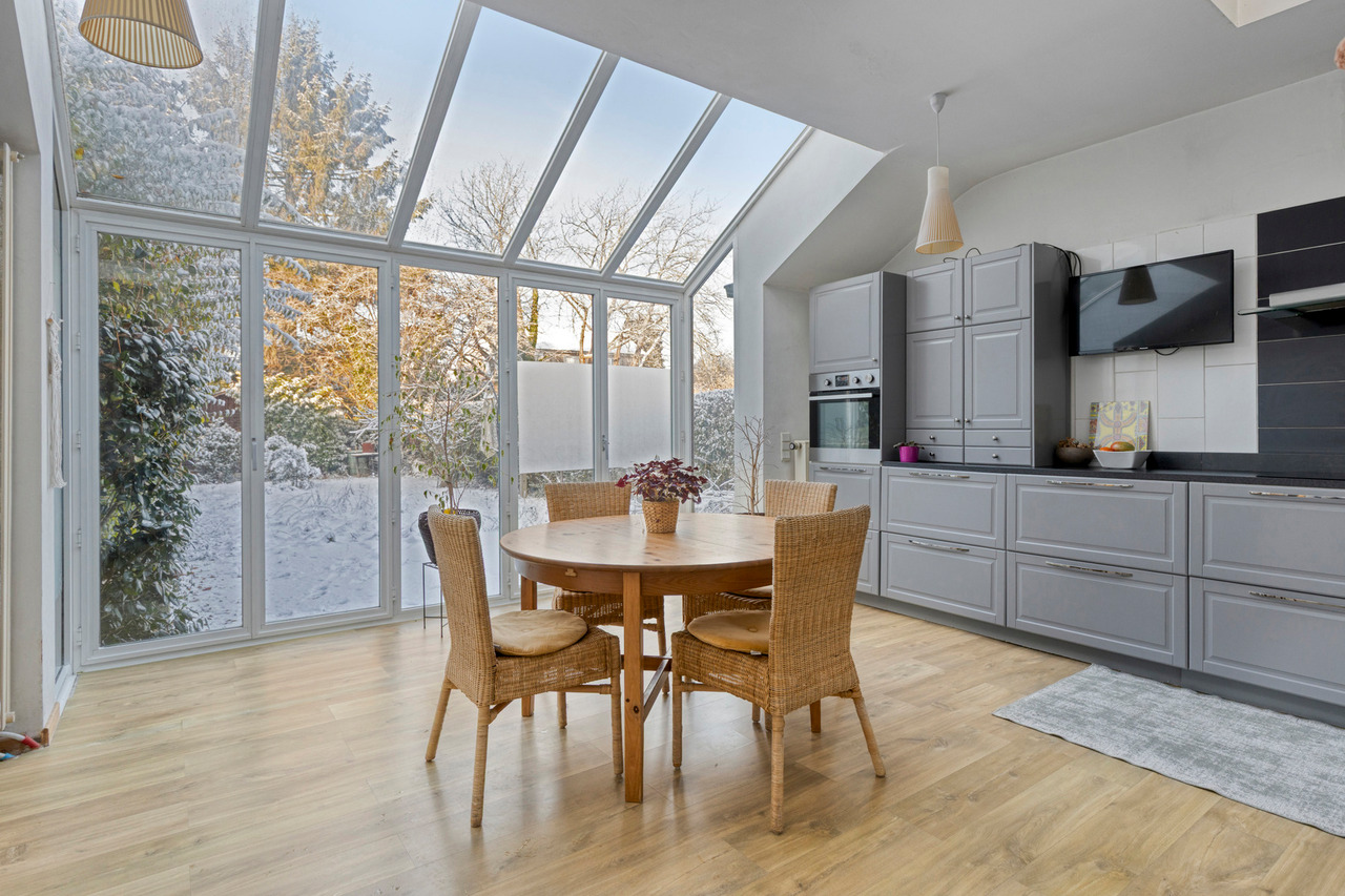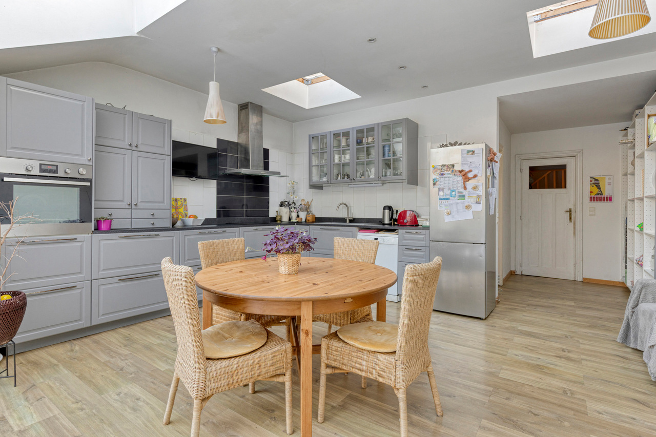 Via de inkomhal met gastentoilet betreedt u de woning, die toegang geeft tot de gezellige leefruimte. Aansluitend is er een aparte bureauruimte, ideaal voor thuiswerk of een rustige leesplek. De keuken en eetplaats vormen samen een aangename leefzone met mooi zicht op en directe toegang tot de tuin, wat zorgt voor een fijne verbinding tussen binnen en buiten.