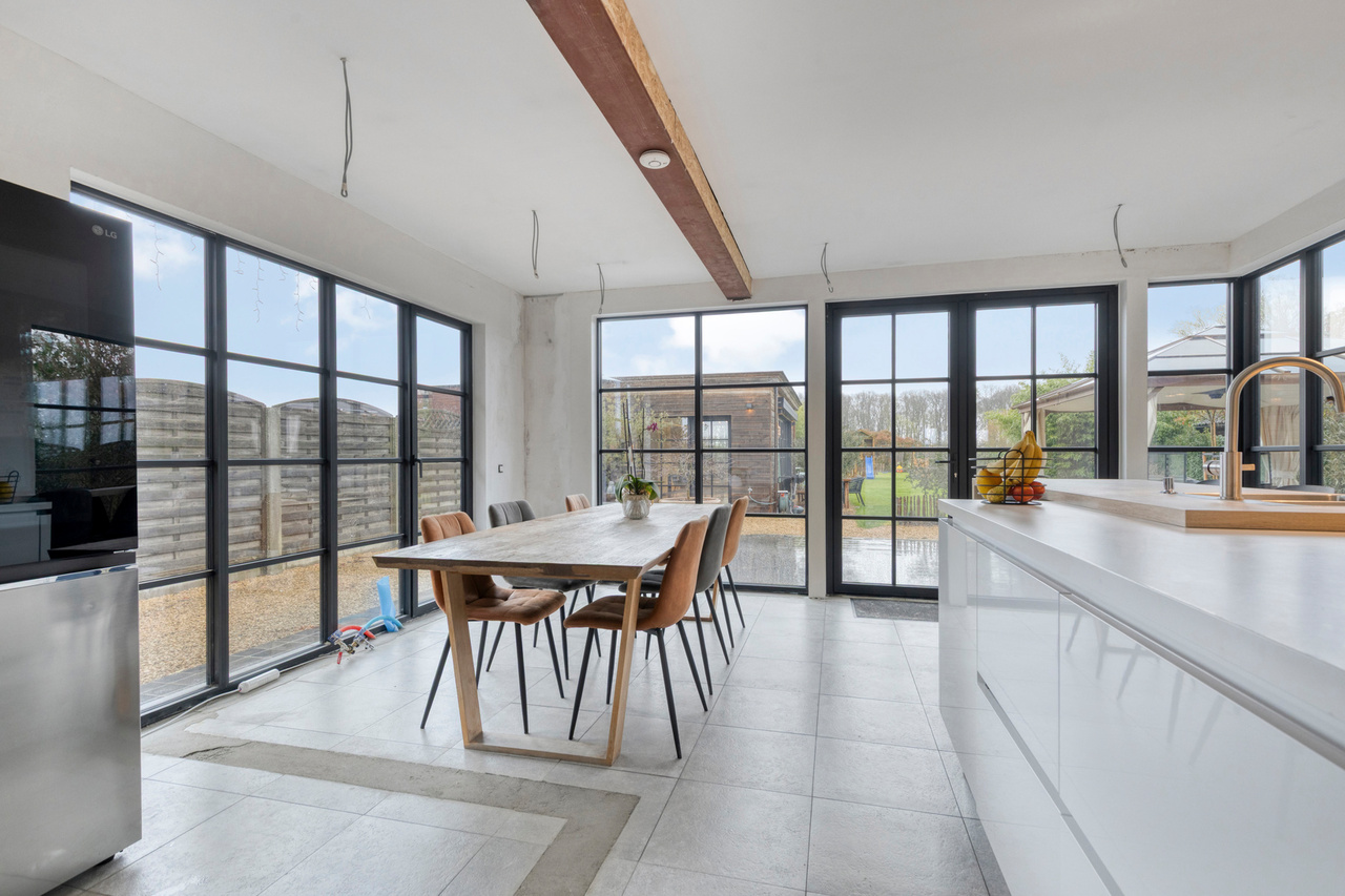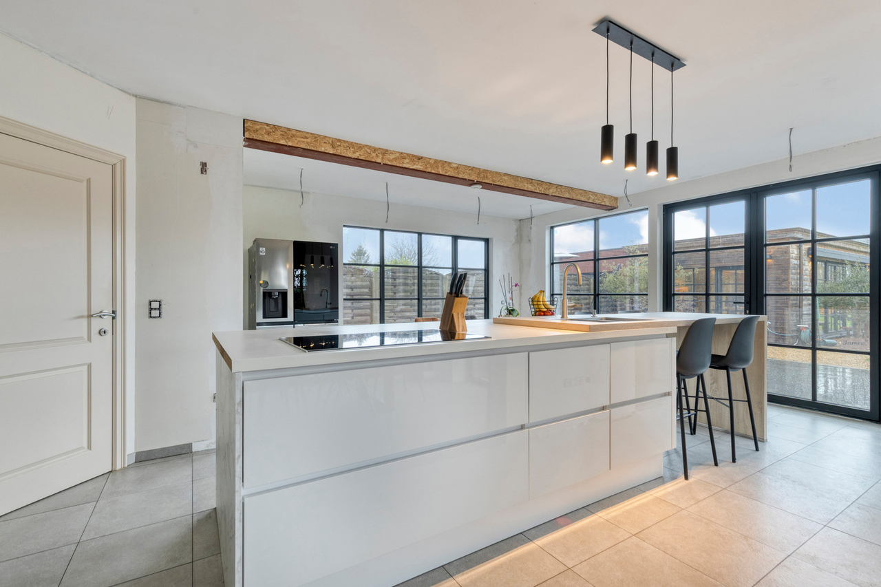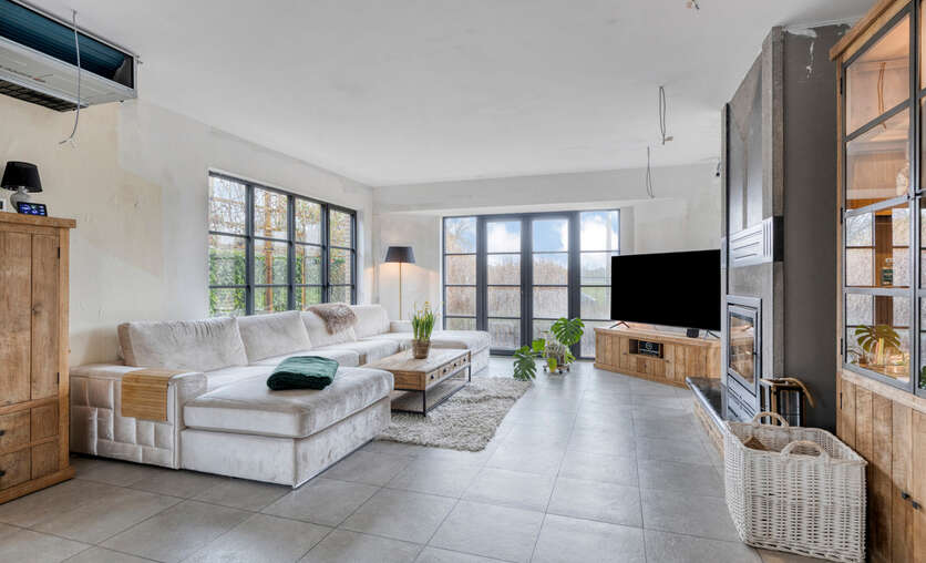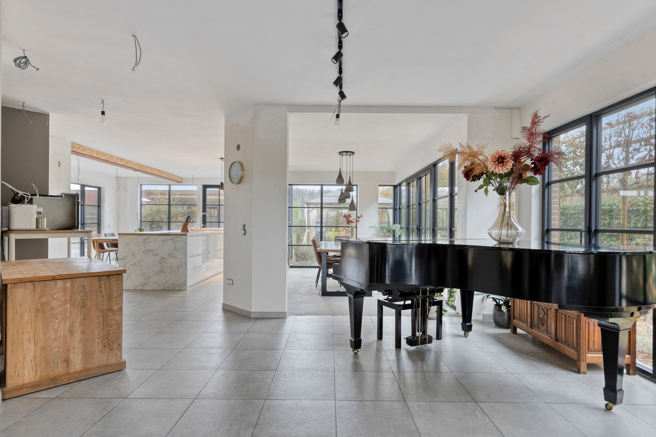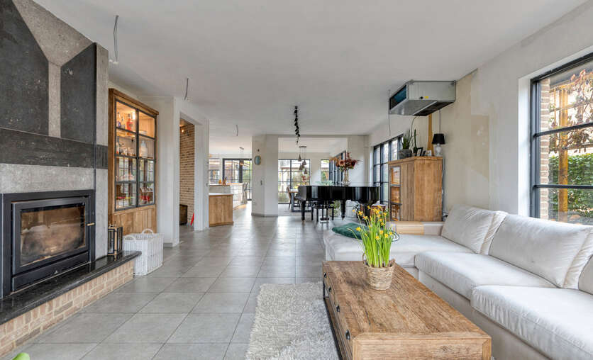 Via de inkomhal met gastentoilet ontvouwt zich een uitzonderlijk ruime leefruimte met open keuken van meer dan 90 m² — dé centrale plek om te wonen, te beleven en gasten te ontvangen. Grote raampartijen zorgen voor een aangename connectie met de tuin en laten het daglicht rijkelijk binnenstromen. De open haard voegt extra sfeer en karakter toe aan deze indrukwekkende ruimte.