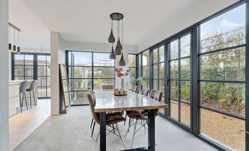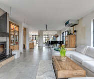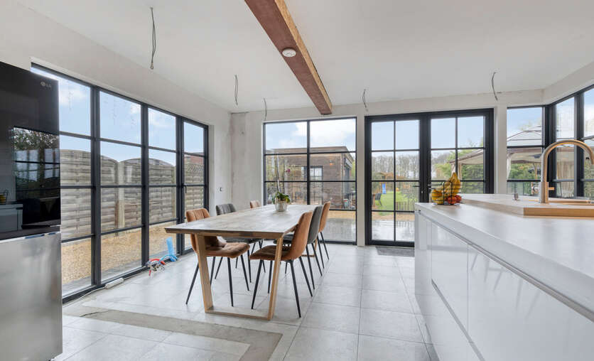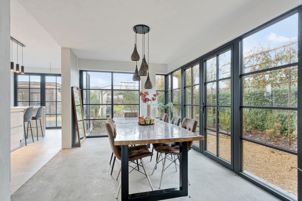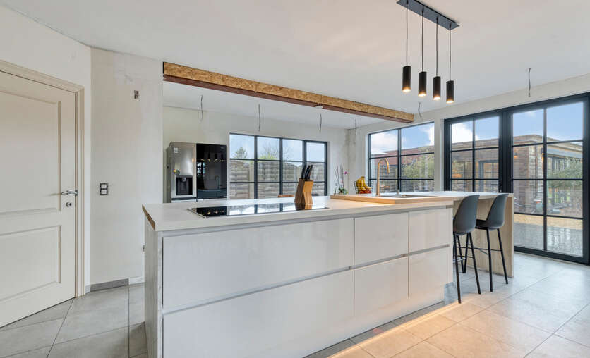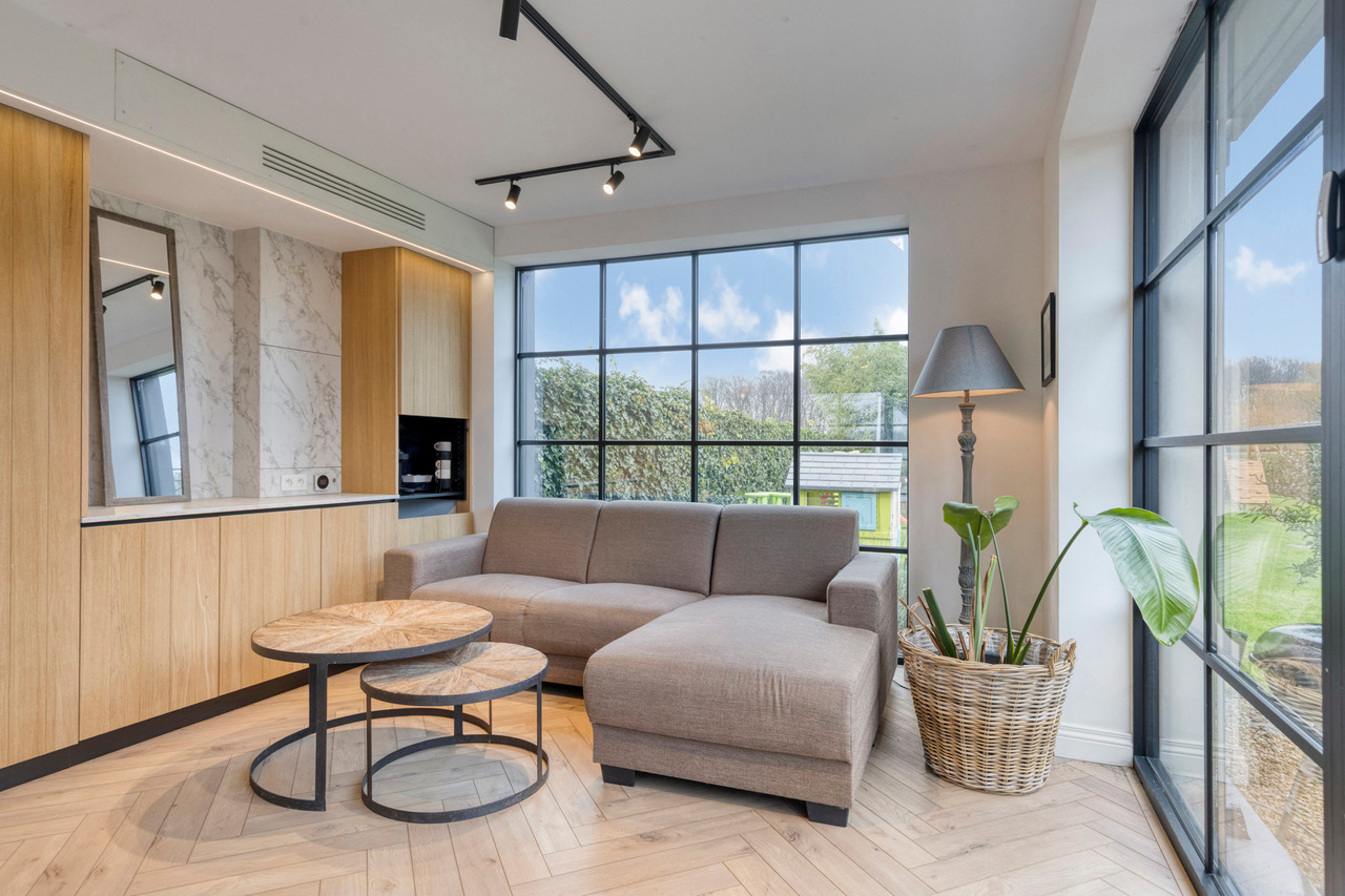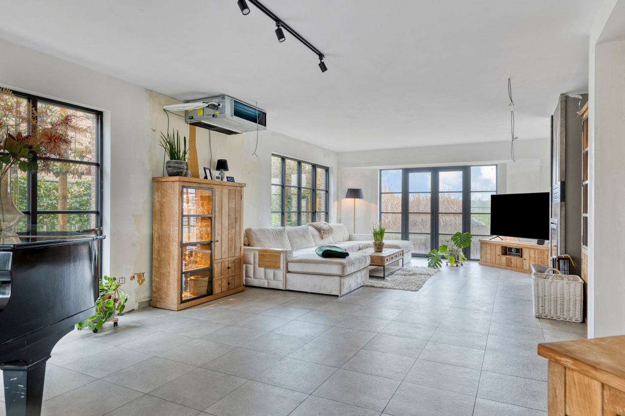 Via de inkomhal met gastentoilet ontvouwt zich een uitzonderlijk ruime leefruimte met open keuken van meer dan 90 m² — dé centrale plek om te wonen, te beleven en gasten te ontvangen. Grote raampartijen zorgen voor een aangename connectie met de tuin en laten het daglicht rijkelijk binnenstromen. De open haard voegt extra sfeer en karakter toe aan deze indrukwekkende ruimte.
