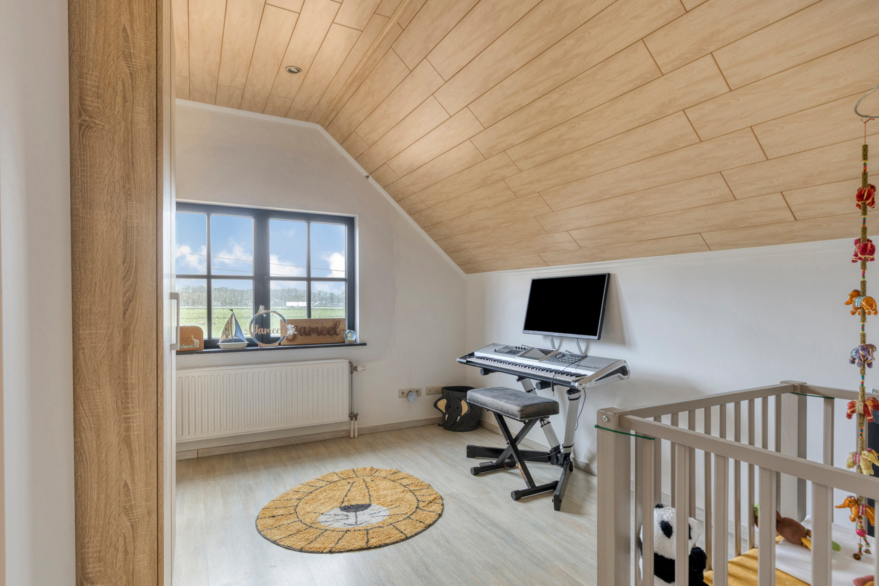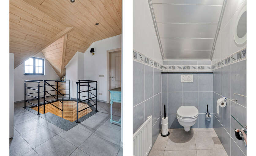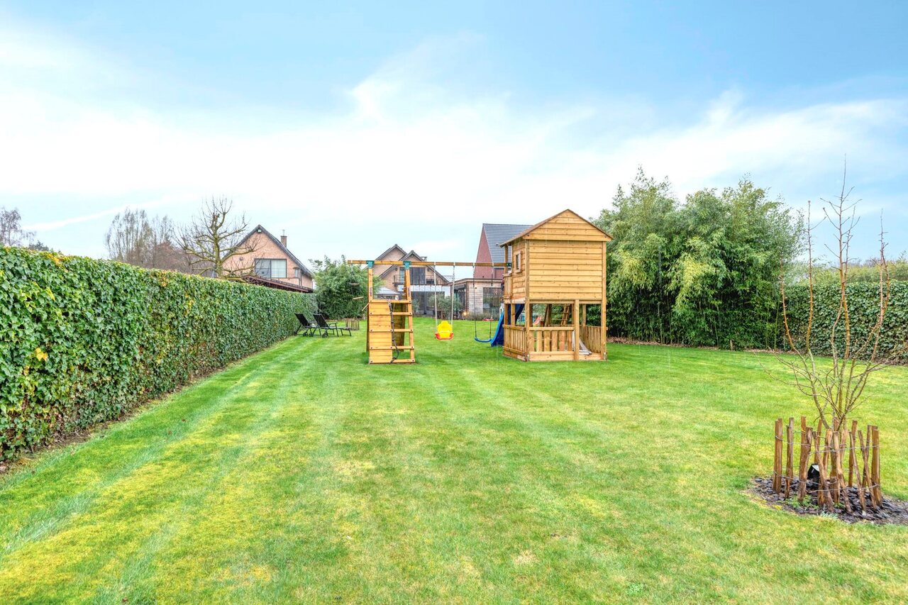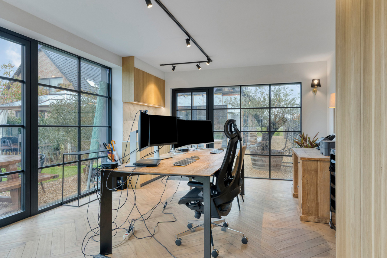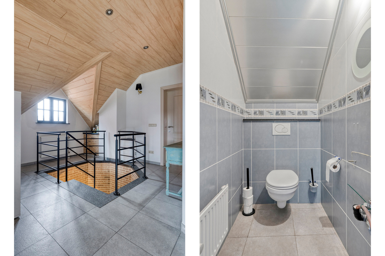 Op het gelijkvloers bevinden zich verder een bureau en een praktische berging. De verdieping omvat een nachthal die toegang geeft tot vier volwaardige slaapkamers, een badkamer en een afzonderlijk toilet, waardoor deze woning perfect aansluit bij de noden van een gezin dat ruimte en comfort centraal stelt.
