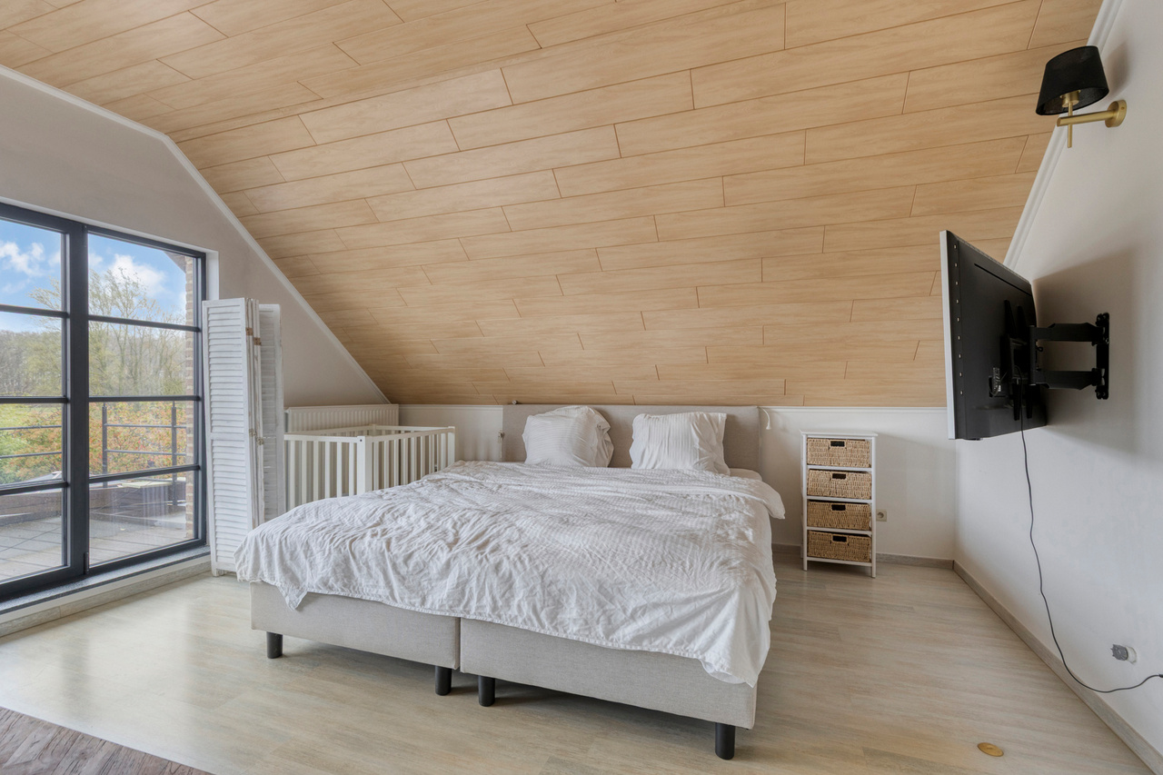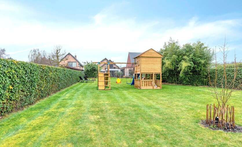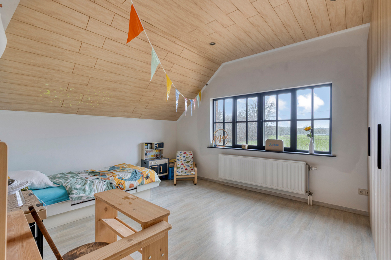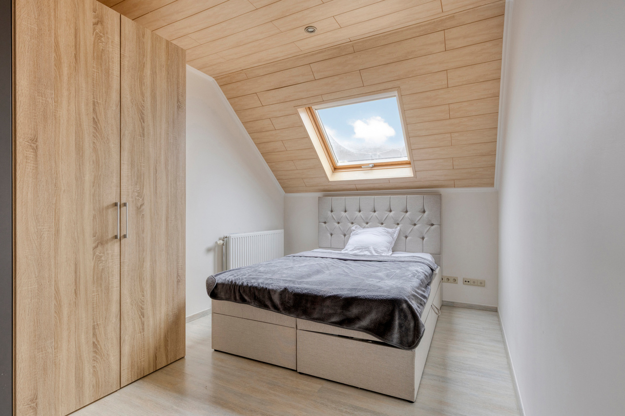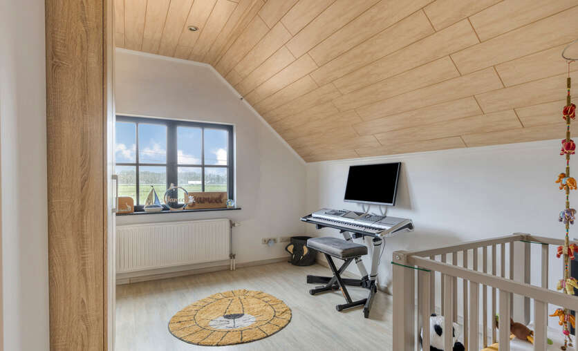 Op het gelijkvloers bevinden zich verder een bureau en een praktische berging. De verdieping omvat een nachthal die toegang geeft tot vier volwaardige slaapkamers, een badkamer en een afzonderlijk toilet, waardoor deze woning perfect aansluit bij de noden van een gezin dat ruimte en comfort centraal stelt.