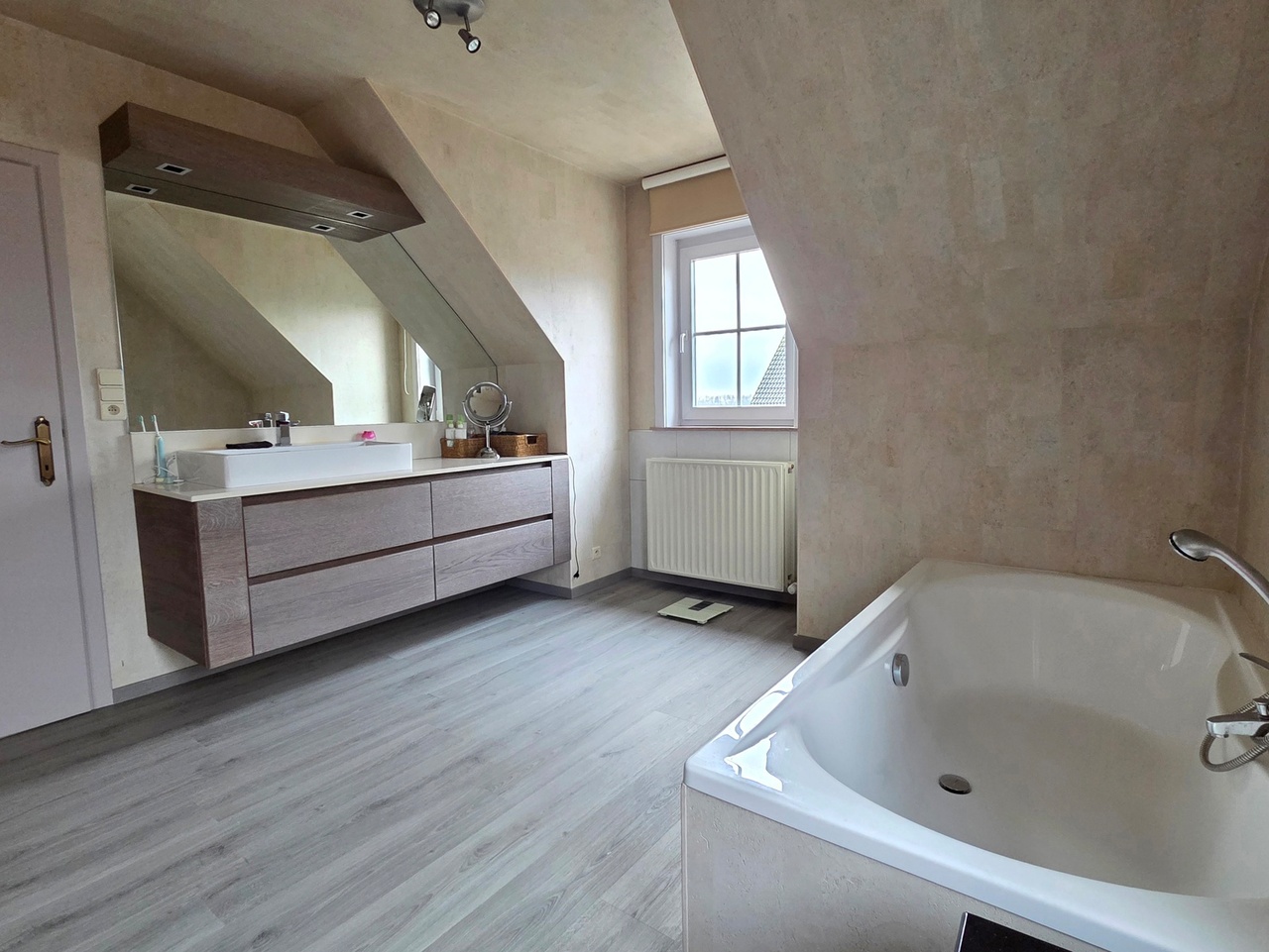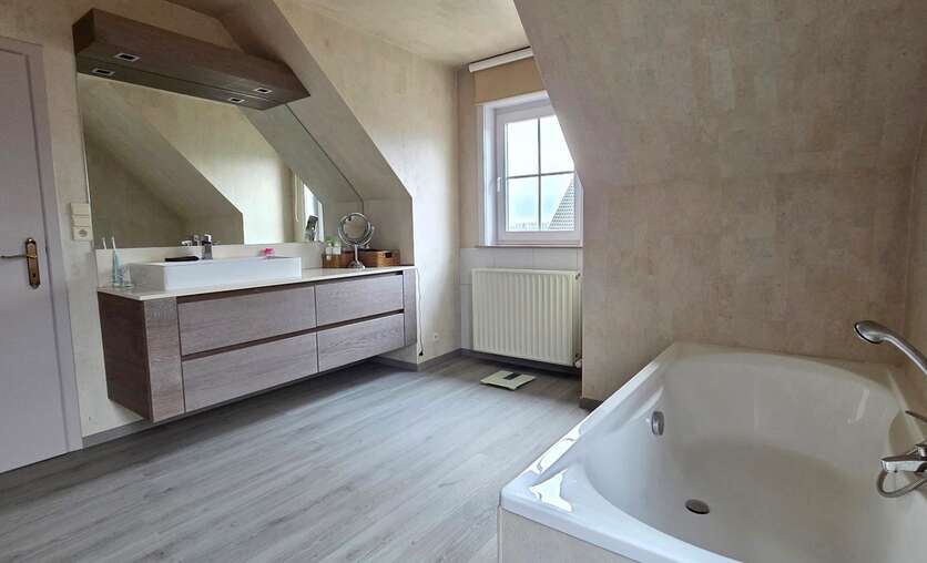 Op de bovenverdieping vindt u een nachthal, een badkamer met ligbad en inloopdouche, een apart toilet en drie ruime slaapkamers, ideaal voor een gezin.