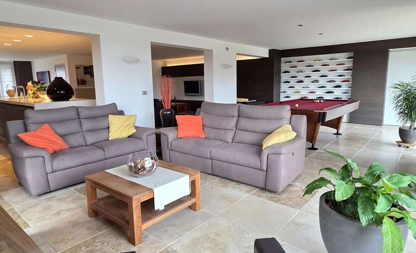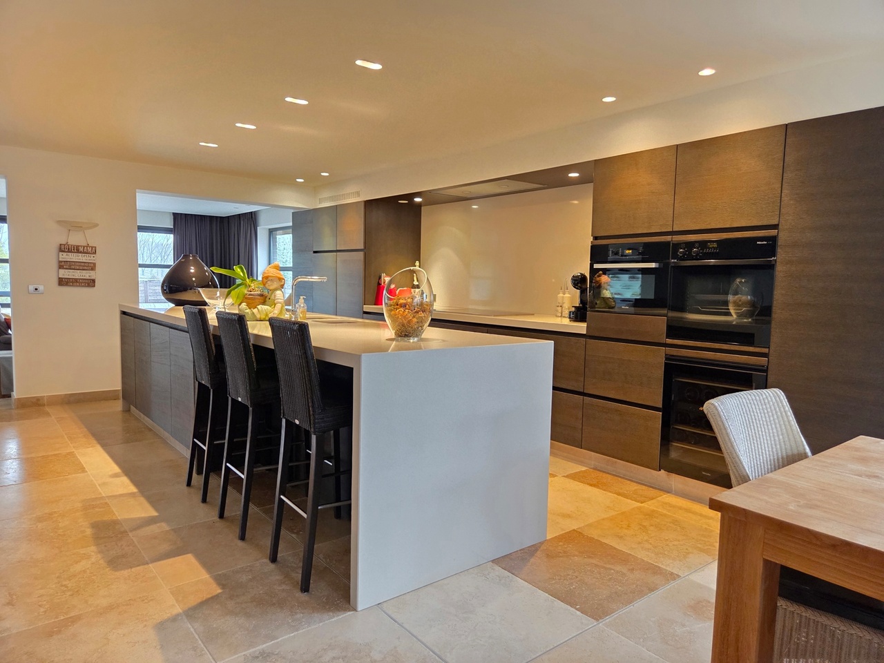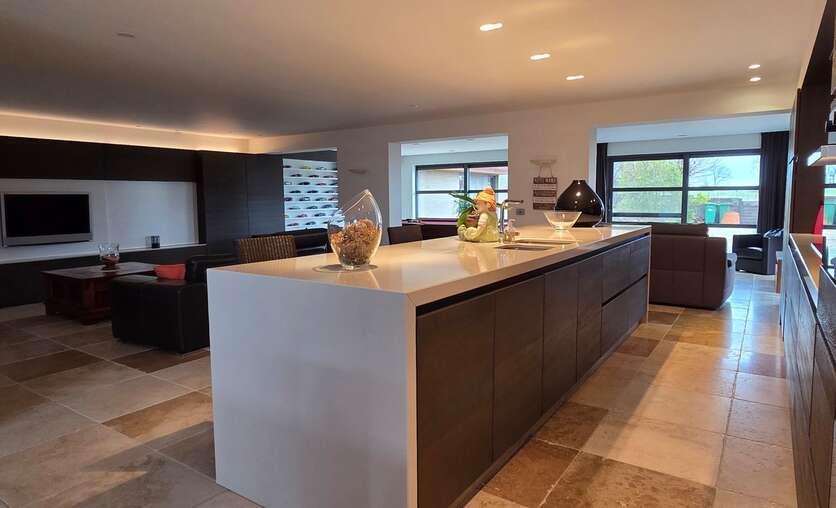 U wordt verwelkomd in een stijlvolle inkomhal met gastentoilet en praktische vestiairehoek. Het gelijkvloers beschikt over een royale woonkamer en een super-de-luxe keuken van maar liefst 115 m², een droom voor iedere kookliefhebber.