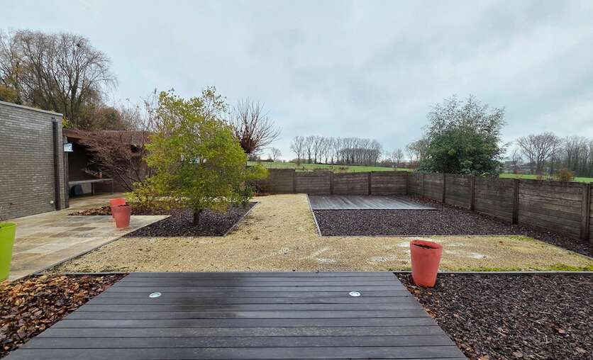 Aan de tuin grenst een overdekt terras, ideaal om buiten te ontspannen, en er is een ruime berging aanwezig.